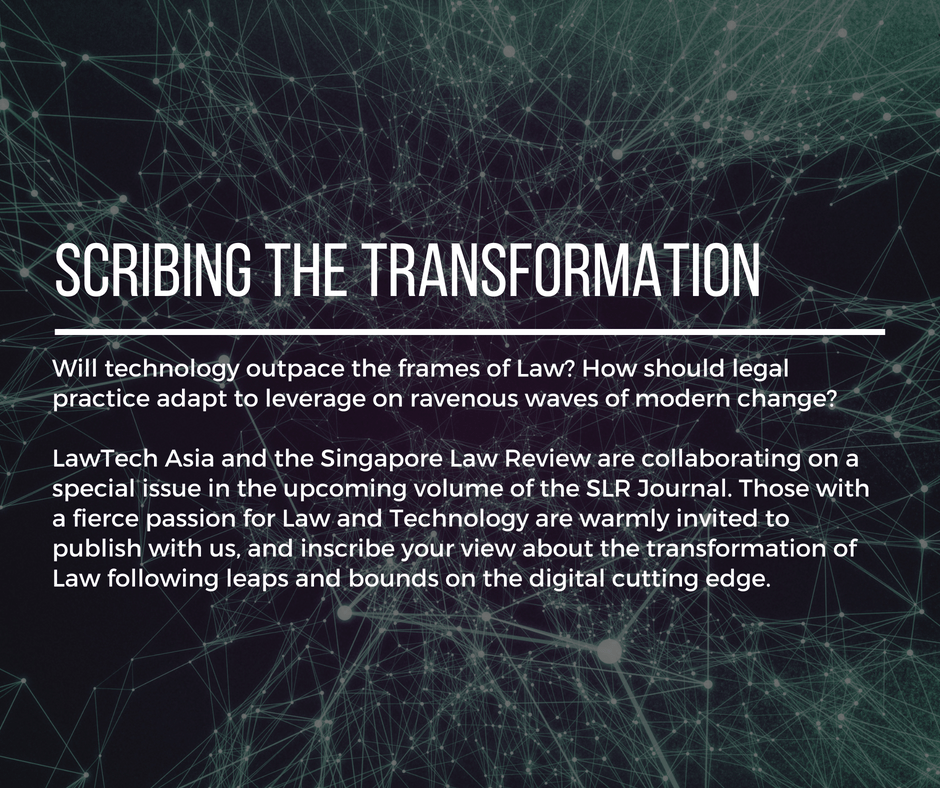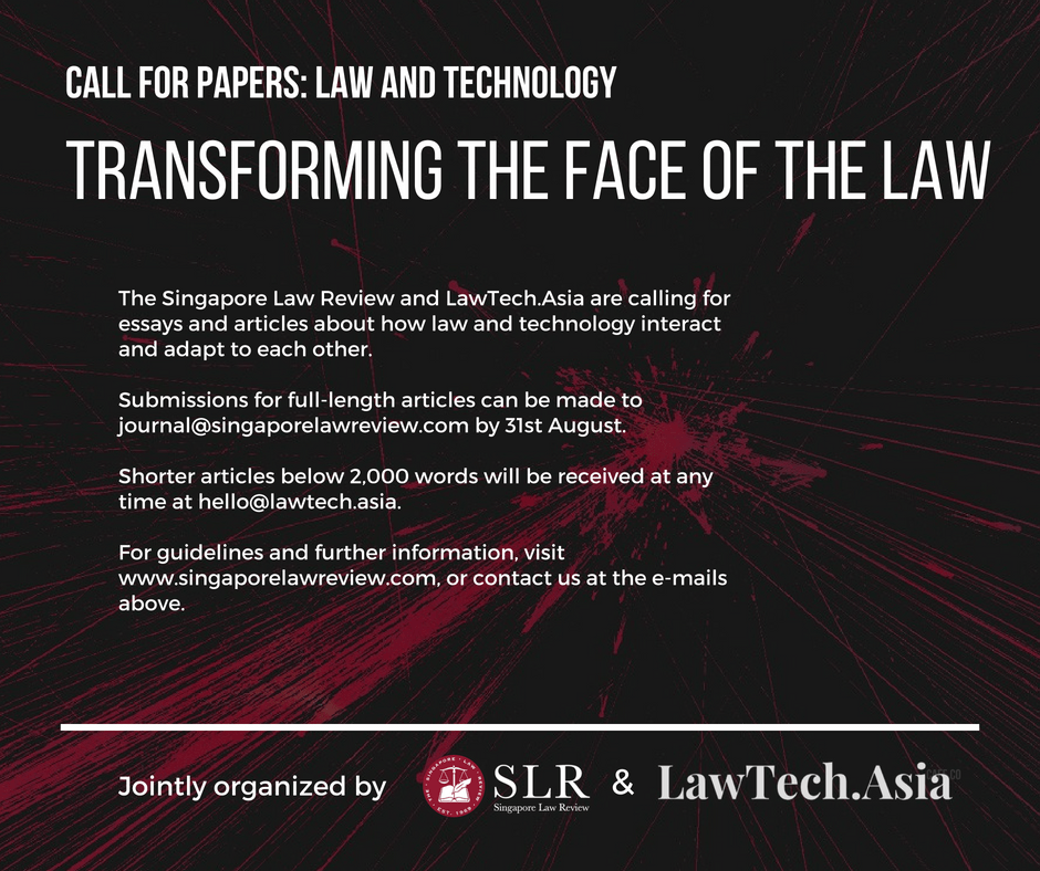 The Singapore Law Review (“SLR”), Asia’s oldest student-run legal publication, and LawTech.Asia, Southeast Asia’s foremost law and technology review, are collaborating on a special issue of the Singapore Law Review journal and LawTech.Asia online publication on the theme “Law x Technology: Transforming the face of the Law”.